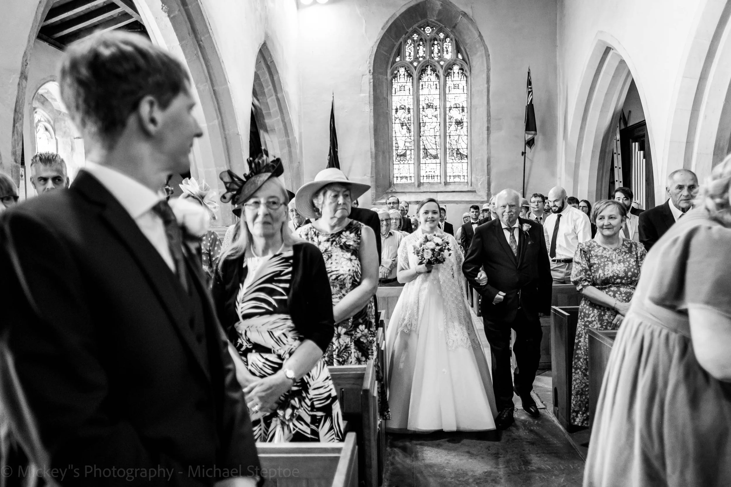 Groom and guests looking on as the bride is walked down the aisle with her father by her side.