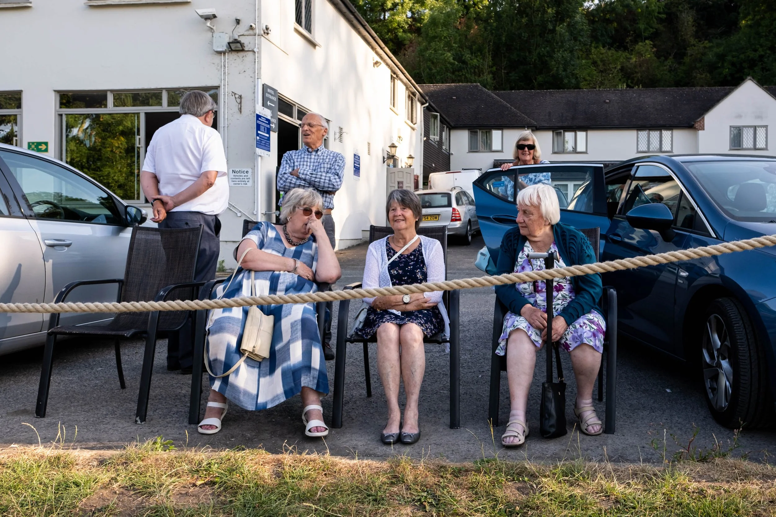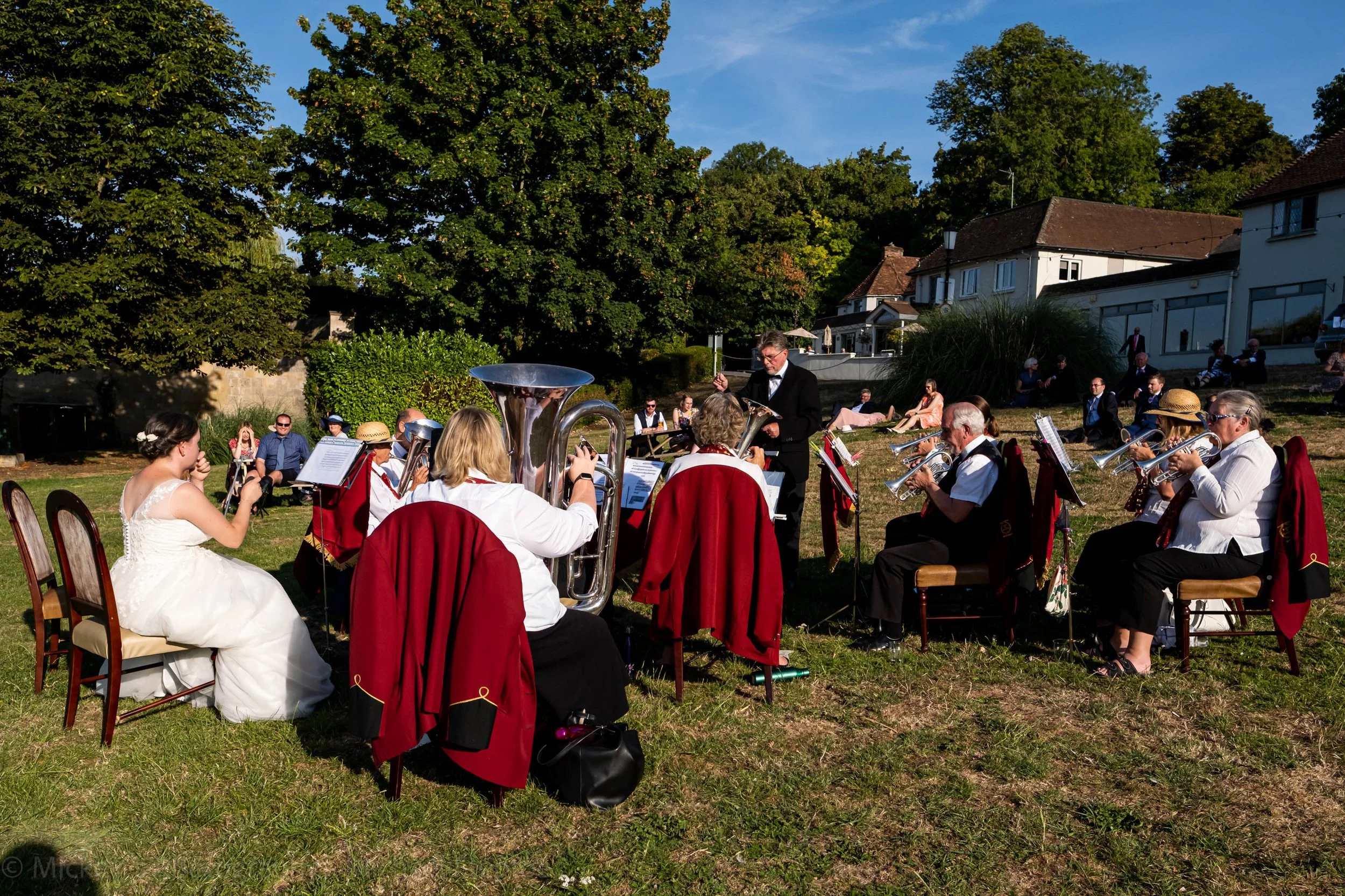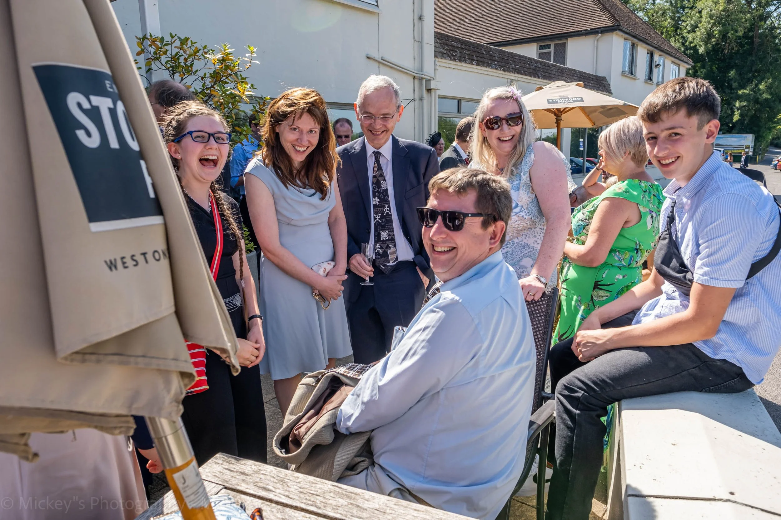 Bride and Groom and family and friends sit by the river bank outside the Shillingford bridge hotel enjoying the music that's being played by the brass band